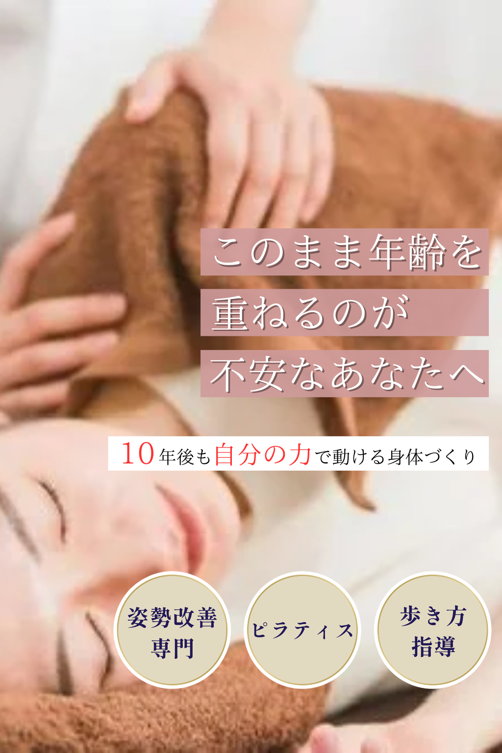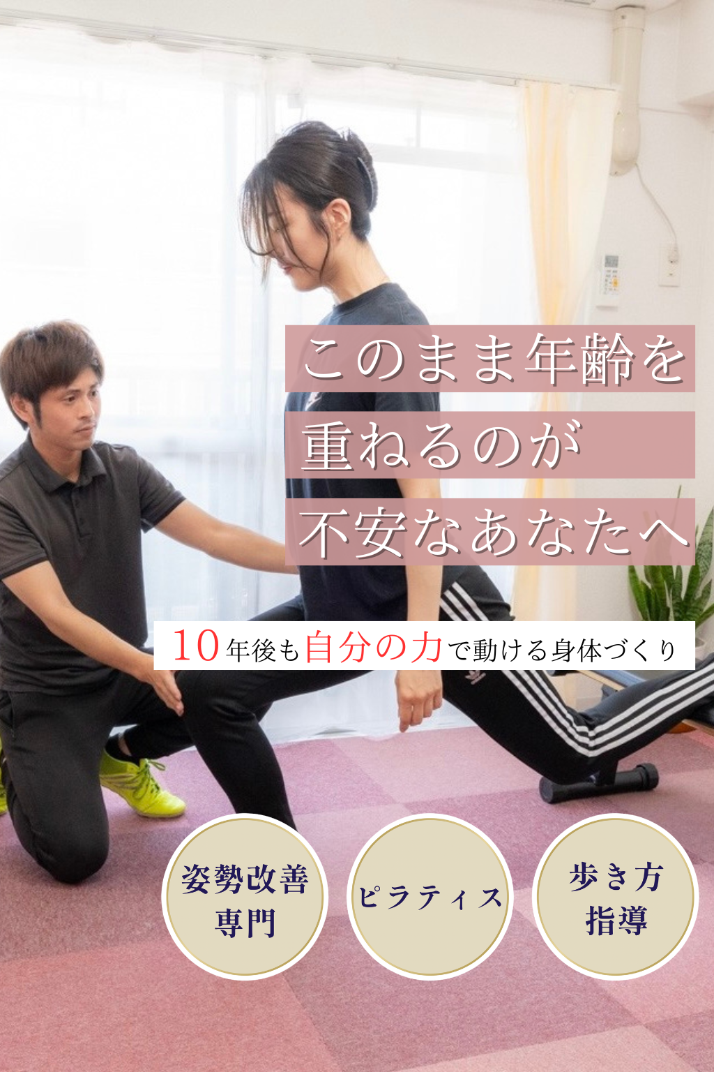 当店は、姿勢改善に特化したパーソナルトレーニングスタジオです。肩こりや腰痛、体型の変化は年齢だけが原因ではありません。無理に鍛えるのではなく、姿勢を整え、正しく身体を使えるようになることで、今からでも身体は変えられます。将来の不安を減らし、自分の身体に自信を持てる状態を目指します。